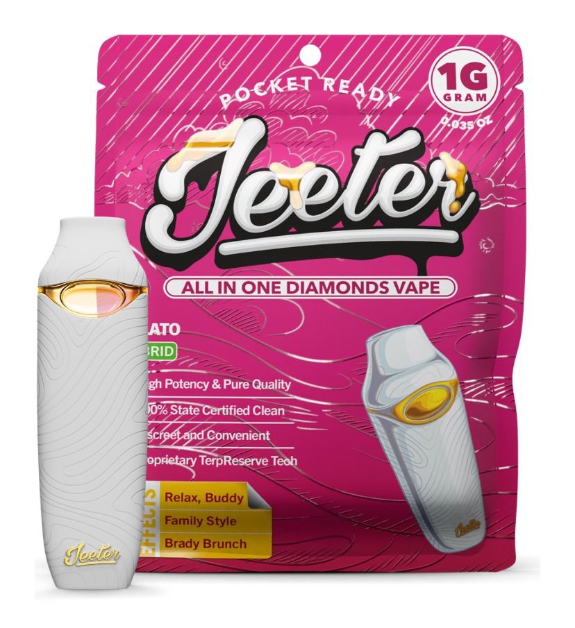 Jeeter Diamonds AIO Vapes are pre-filled, ready to use devices featuring our most refined extract. We melt crystallized THCA into a pure oil and pair it with strain-specific terpenes crafted by Jeeter’s terpene experts to deliver smooth, hard-hitting vapor with bold flavor.